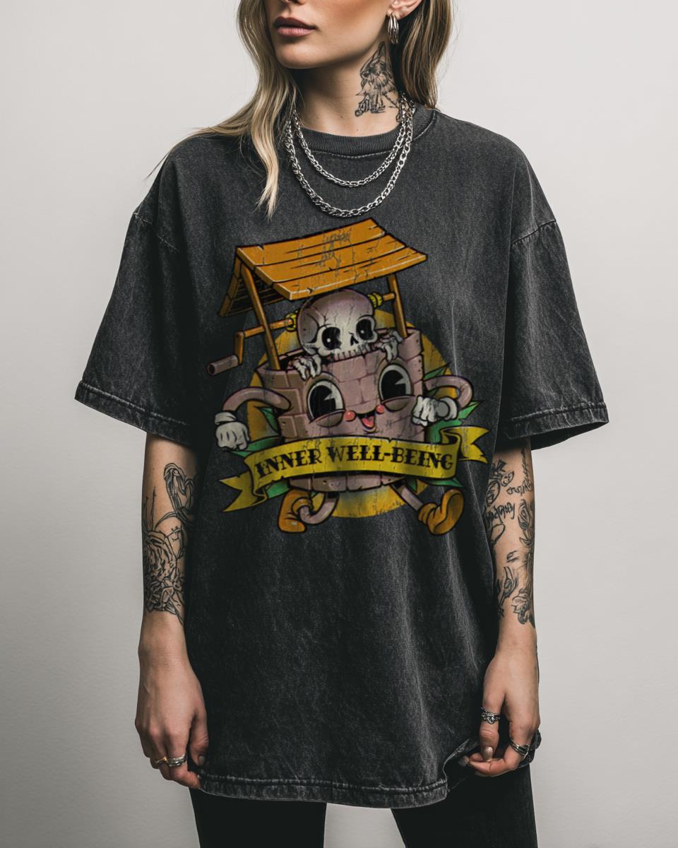 Do you have a taste for the macabre mixed with a touch of dark humor and vintage aesthetics? Explore your ‘Inner Well-Being’ with this unique vintage cartoon skeleton graphic T-shirt. Featuring a creepy yet captivating old-school design, this tee combines elements of horror, retro style, and a hint of dark humor, perfect for those who…