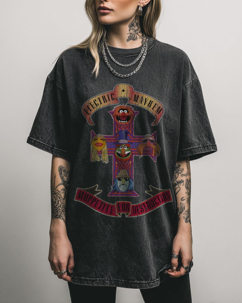 Why is this Muppetite For Mayhem Tee a Rocking Choice? Unleash your inner Animal with this Muppetite For Mayhem Muppets Electric Mayhem Metal Tee, a hilarious parody graphic inspired by the legendary Muppet band. Crafted from 100% soft cotton in a cool Black Acidwash finish, this unisex t-shirt is perfect for fans of 80s heavy…