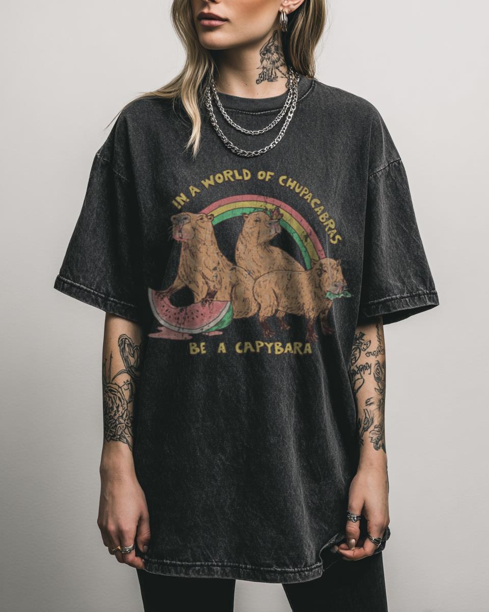 Why This ‘Be A Capybara’ T-Shirt Spreads Positivity? Embody kindness and chill vibes with this ‘Be A Capybara’ T-shirt, a charming graphic tee featuring the internet’s favorite friendly rodent. This black acidwash shirt, inspired by retro aesthetics and wholesome memes, is perfect for spreading a positive message and making friends. Highlights of Your New Favorite…