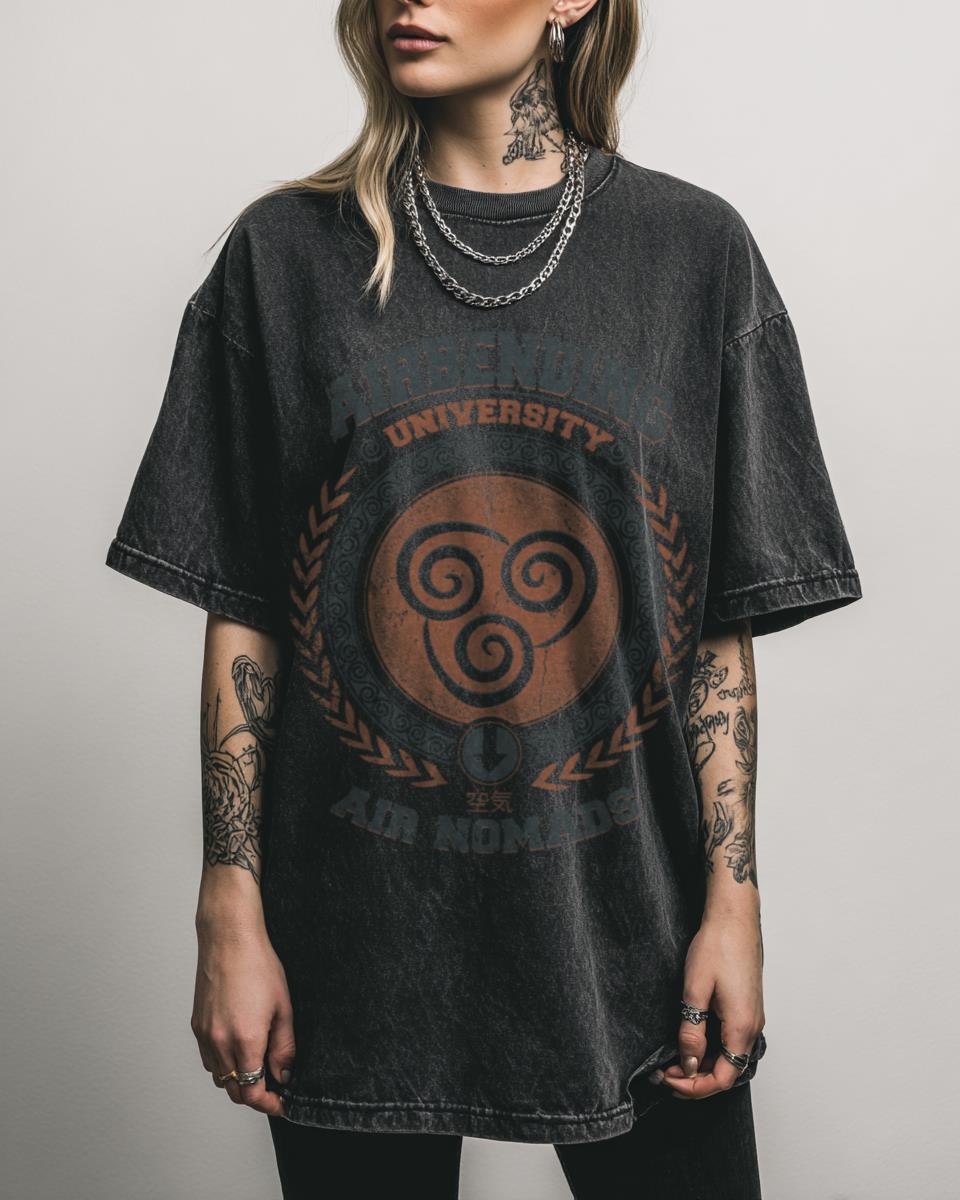 What Makes This Avatar Airbending Aang University Last Airbender Tee Iconic? Master the elements with this unique Avatar Airbending Aang University Last Airbender Tee. Featuring a stylized printed graphic inspired by Aang and the Air Nomads, this black acidwash t-shirt is perfect for fans of Avatar: The Last Airbender. Crafted from 100% cotton with a…