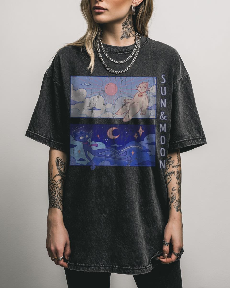 Searching for a unique blend of cute cats, anime, and mystical aesthetics? Discover the enchanting world of ‘Misfit & Mieko Sun & Moon’ with this captivating graphic tee! This design features anthropomorphic cats in a sun and moon motif, blending charming anime style with a touch of cosmic aesthetic. Perfect for cat lovers, anime enthusiasts,…