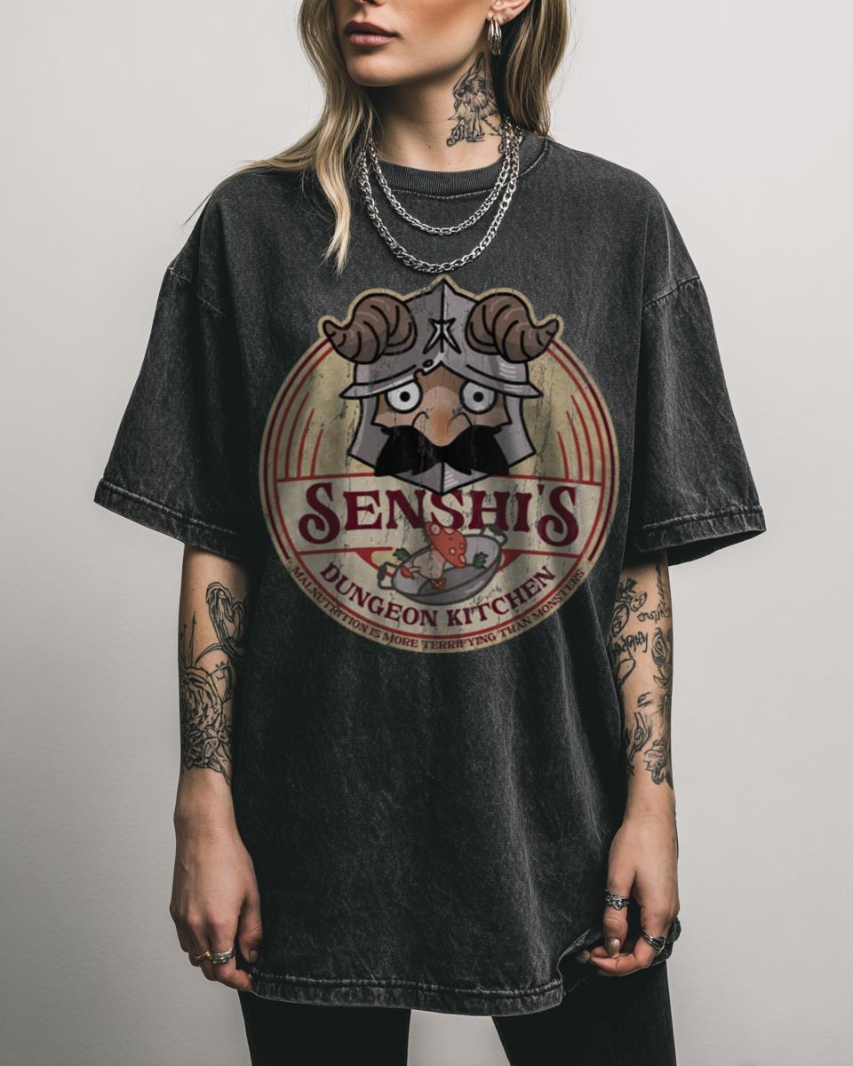 Ready to explore the culinary delights of the dungeon? Step into ‘Senshi’s Dungeon Kitchen’ with this fantastic design inspired by Delicious in Dungeon (Dungeon Meshi)! This artwork features the beloved character Senshi in a cooking setting, blending the thrilling world of fantasy dungeons with the unexpected joys of gourmet monster cuisine. It’s a humorous and…