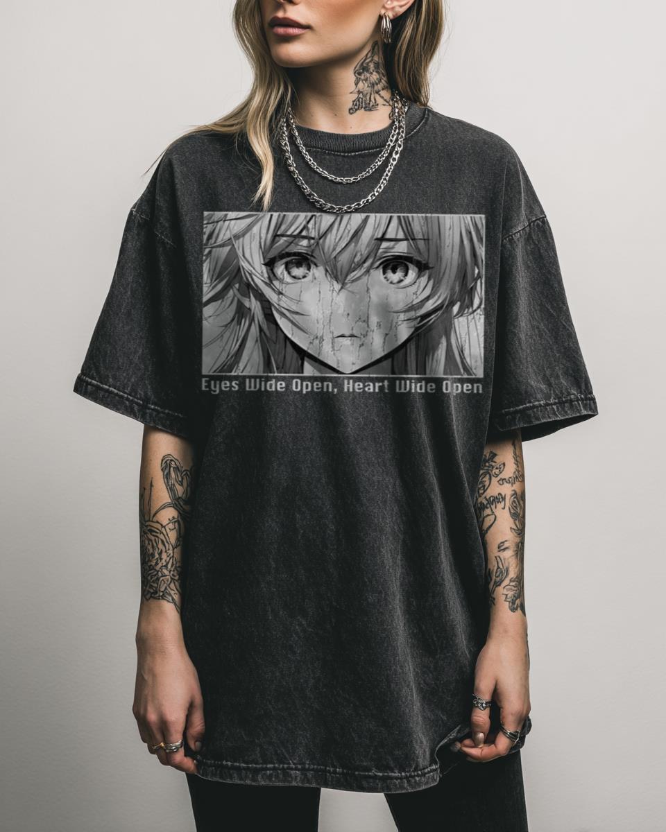 Do you wear your heart on your sleeve and your emotions in your eyes? Convey deep feelings with our “Emotional Anime Girl Eyes” T-shirt! This poignant black and white design features a close-up of anime girl eyes, expressing profound emotion, paired with the phrase “Eyes Heart Wide Open.” It’s a beautifully hand-drawn piece, blending manga…