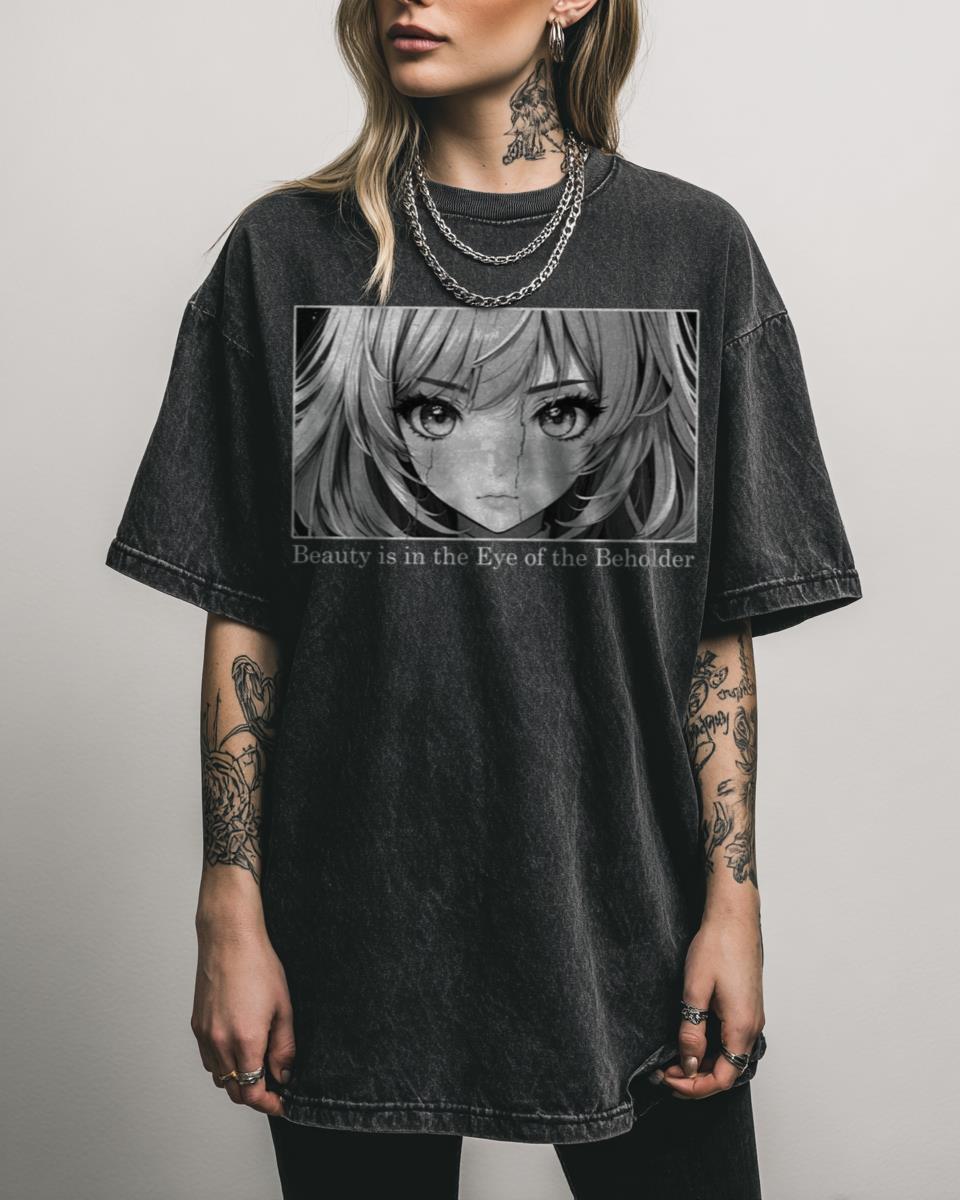 Do you believe true beauty lies in perception? Express your artistic philosophy with our “Monochrome Anime Girl Eyes” T-shirt! This striking black and white design features a close-up of emotional anime girl eyes, accompanied by the profound phrase “Beauty In The Eyes Of The Beholder.” It’s a beautifully hand-drawn piece, blending manga aesthetics with a…
