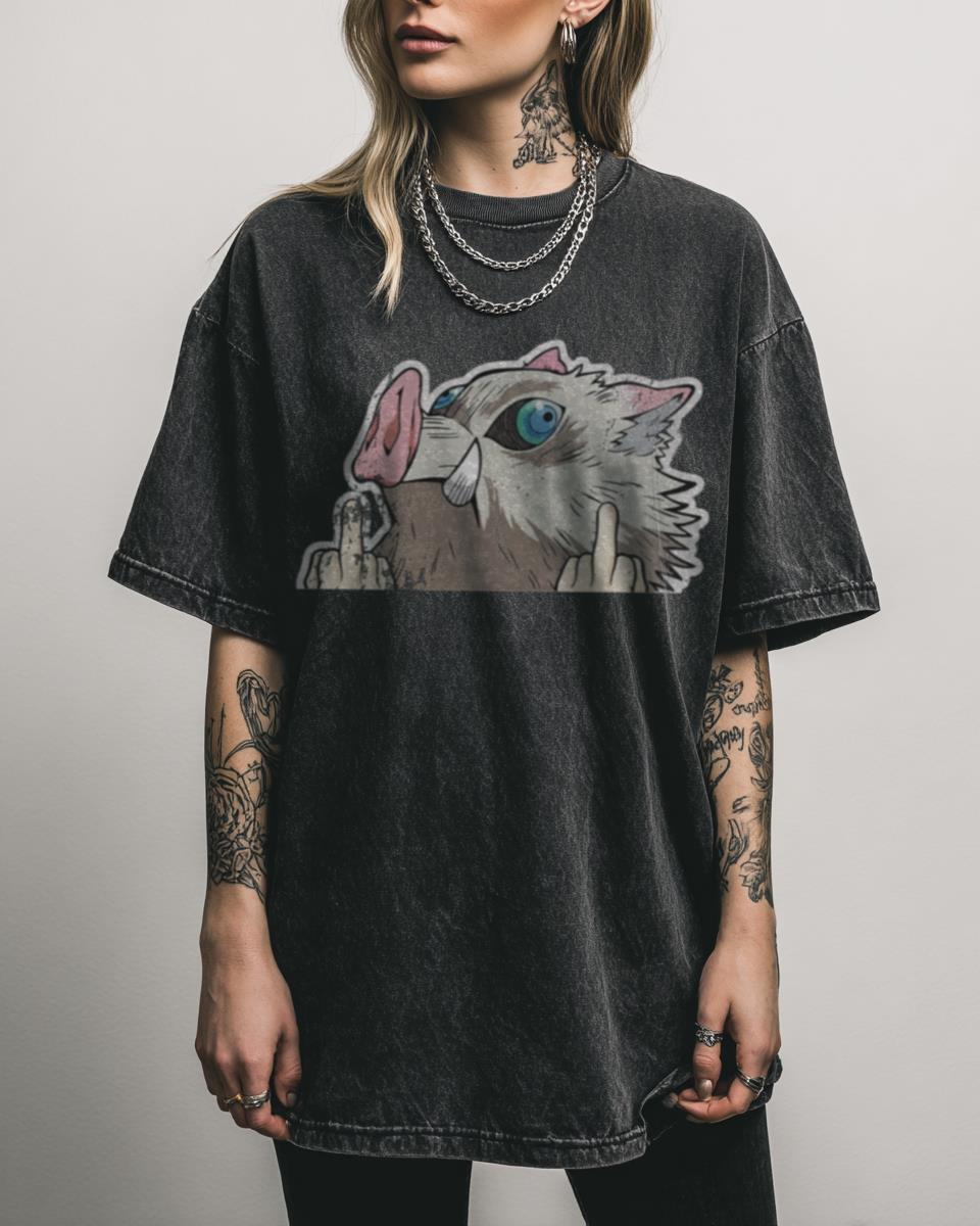 Why This Inosuke Middle Finger T-Shirt is a Bold Statement? Make a bold, humorous statement with this Inosuke Middle Finger T-shirt, a fan-created “peeker” design featuring the irreverent Demon Slayer character. This unique black acidwash tee is perfect for fans of Kimetsu no Yaiba who appreciate Inosuke’s wild and unfiltered personality. Features for the Edgy…