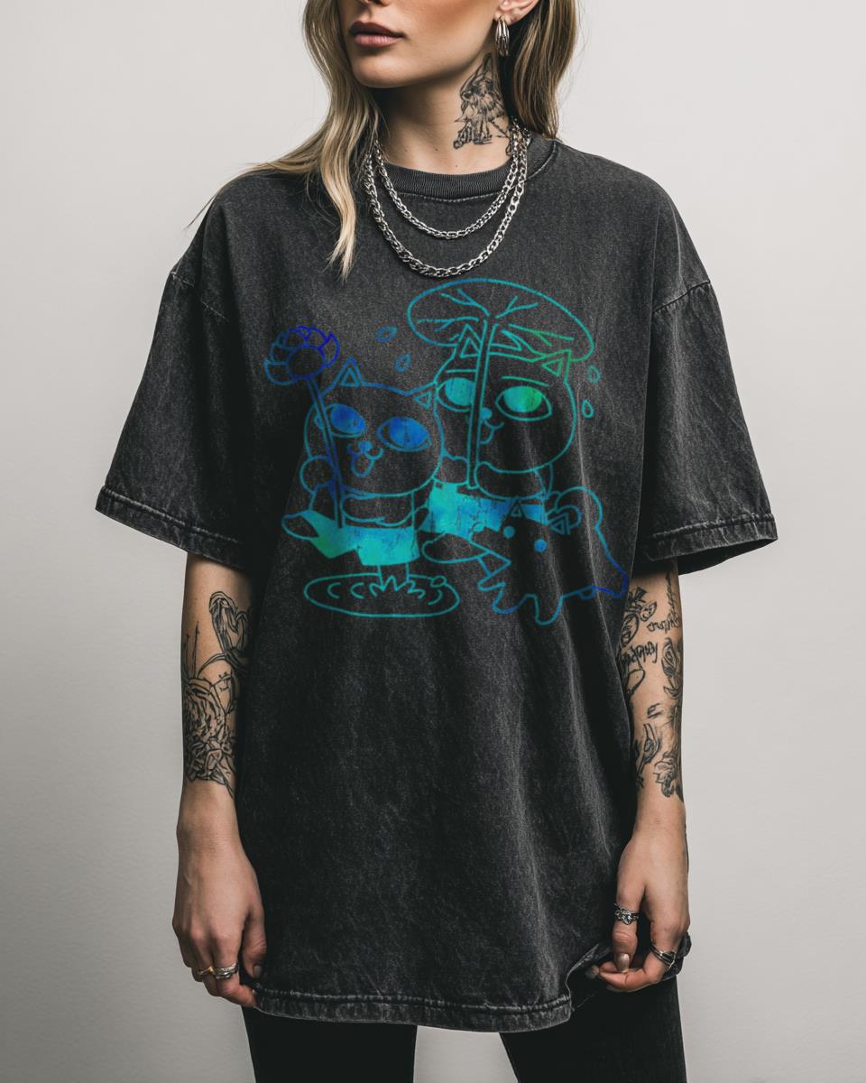 Embrace the whimsical melancholy of a ‘Rainy day’ with this unique animecore tee! This intriguing design captures a ‘Rainy day’ aesthetic, infused with the distinctive psychedelic and surreal style of Nekojiru manga and its characters, Nyako and Nyatta. It’s a unique piece for fans of experimental anime, indie manga, and the captivating world of animecore…
