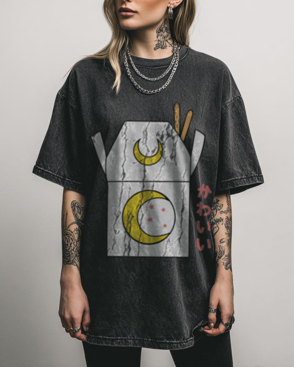 What Makes This Celestial Takeout Box Anime Tee So Cute? Satisfy your cosmic cravings with this adorable Celestial Takeout Box Kawaii Anime Sailor Moon Tee. Featuring a charming, moon-themed takeout box design on a black acidwash 100% cotton shirt, it’s a delightful piece for anime and kawaii culture fans. Charming Features for Anime & Kawaii…