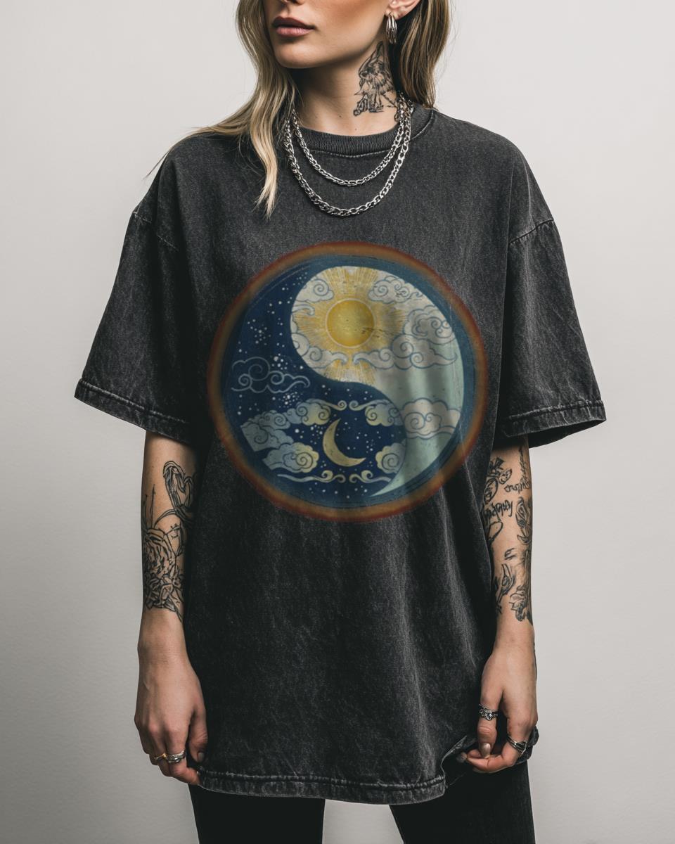 What Makes This Celestial Yin Yang Tee So Harmonious? Find your balance with this Celestial Yin Yang Space Meditation Graphic Tee. Featuring a serene design of the yin-yang symbol intertwined with cosmic elements on a black acidwash 100% cotton shirt, it’s perfect for those seeking spiritual harmony. Key Features for Spiritual & Yoga Enthusiasts: Symbolic…
