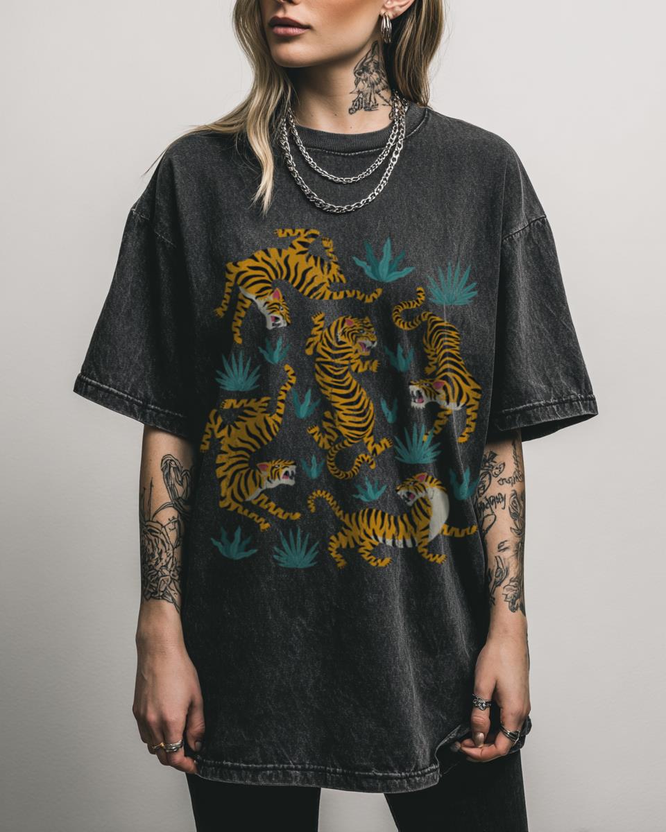 Discover the Allure of Our Tropical Tiger & Leaves T-Shirt? Unleash your wild side with this captivating Tropical Tiger & Leaves T-Shirt. Featuring a striking graphic print of majestic tigers amidst lush tropical foliage, this black acidwash tee brings exotic wildlife fashion to your everyday wardrobe. Why This Exotic Wildlife Tee is a Must-Have: Bold…