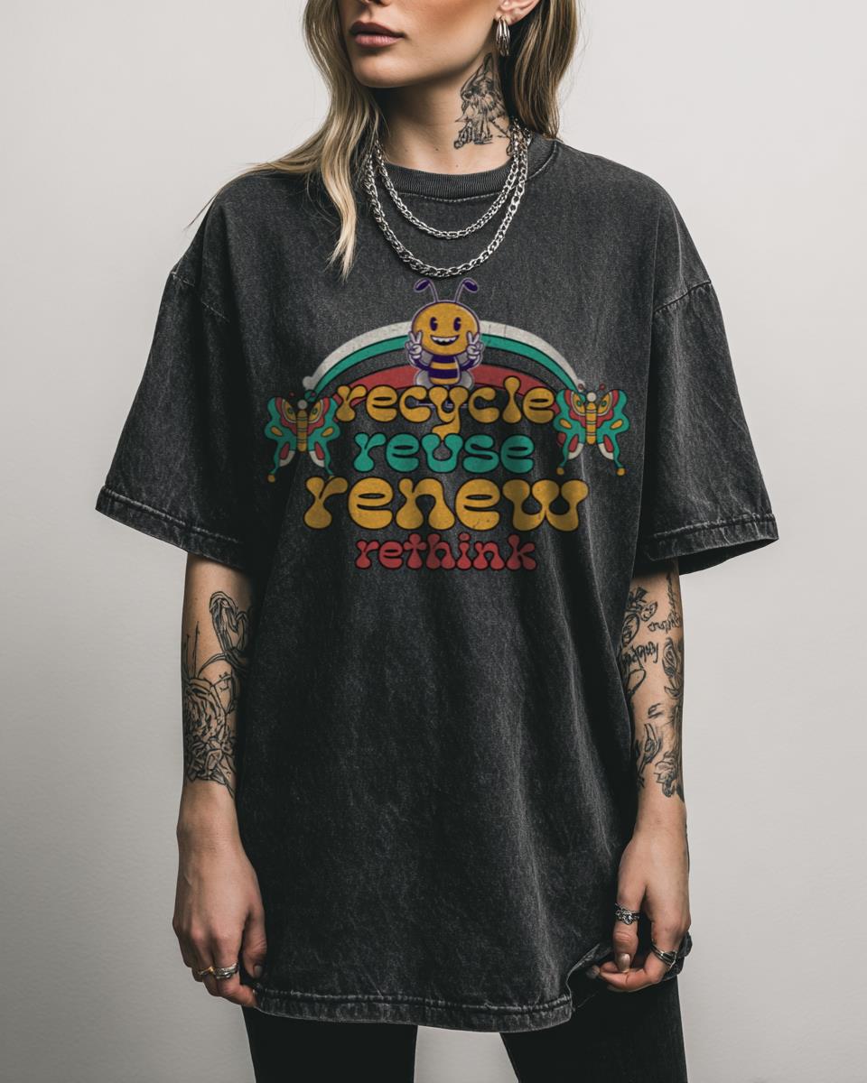 Buzzing with passion for the environment? This adorable “Recycle Reuse Renew Rethink BEE RE” graphic T-shirt combines a vital eco-message with a charming bee motif. It’s a sweet and stylish way to show your love for nature, promote sustainable living, and advocate for our planet’s future. Why You’ll Love This Eco-Bee Tee: High-quality printed graphics…