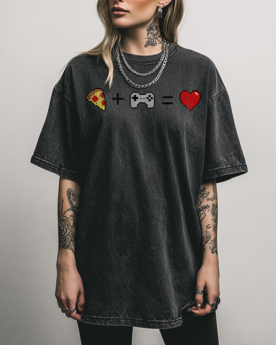 Embrace your true passions with this ultimate gamer’s mantra! This T-shirt features a clever and relatable design declaring “Pizza + Games = Life,” celebrating the simple joys of a gamer’s existence. With a retro, possibly 80s, aesthetic, it’s the perfect statement piece for any geek, nerd, or gaming enthusiast. Why You’ll Love This Gamer Life…