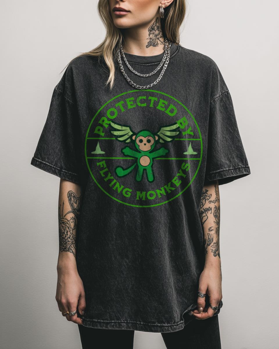 Are you a devoted fan of the enchanting world of Wicked the Musical? Show your allegiance to the Emerald City’s most misunderstood sorceress with this ‘Protected By Flying Monkeys Wicked The Musical’ Black Acidwash T-shirt! This design is a witty and whimsical nod to the iconic Broadway show, celebrating the Wicked Witch of the West…