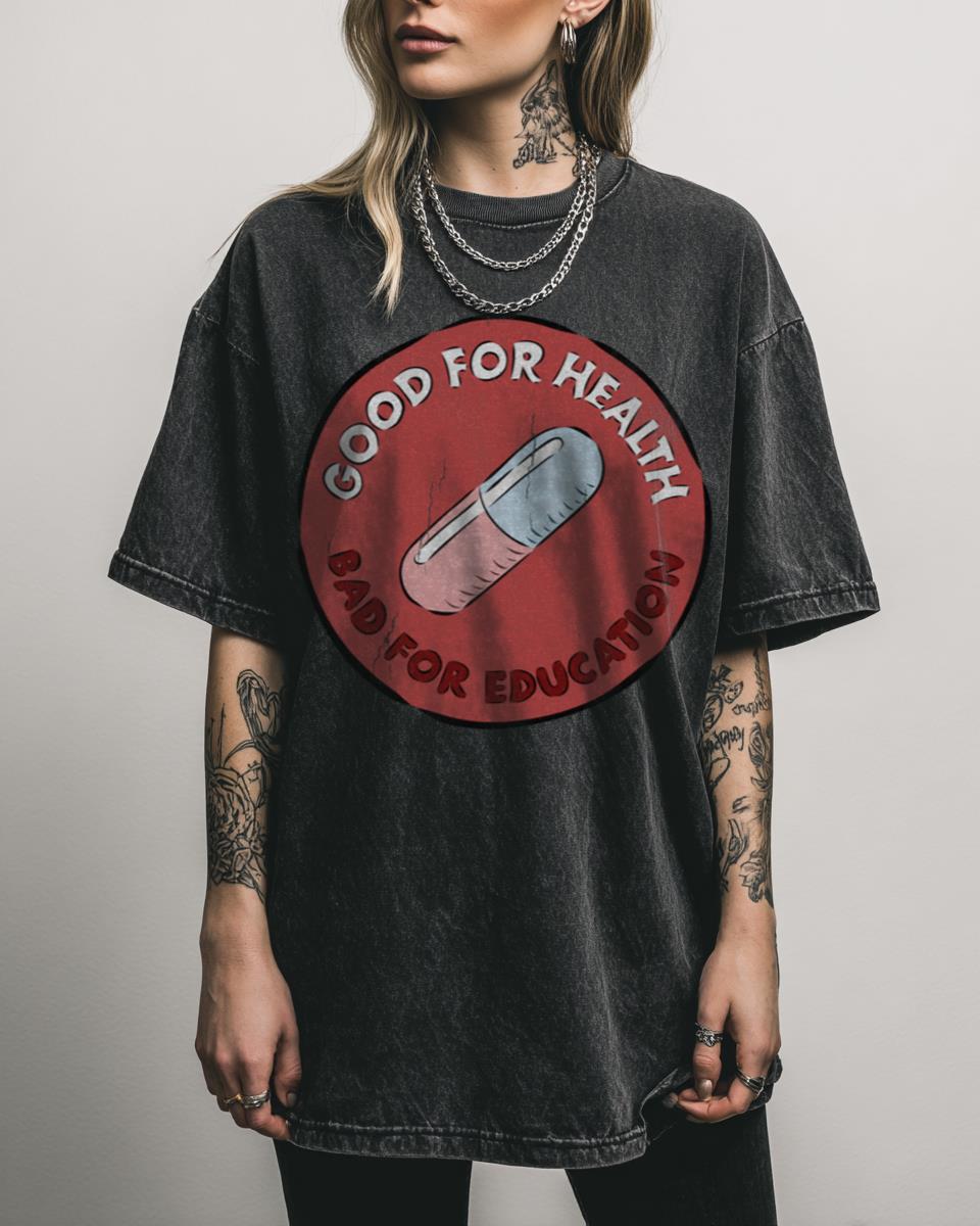 Looking for a witty and rebellious statement tee? Express your unique perspective with this ‘Good for Health, Bad for Education’ anime-inspired graphic t-shirt. This design, featuring a classic pill motif and a thought-provoking slogan, perfectly captures a blend of geek culture and punk attitude. It’s an ideal choice for otaku and anime fans who appreciate…