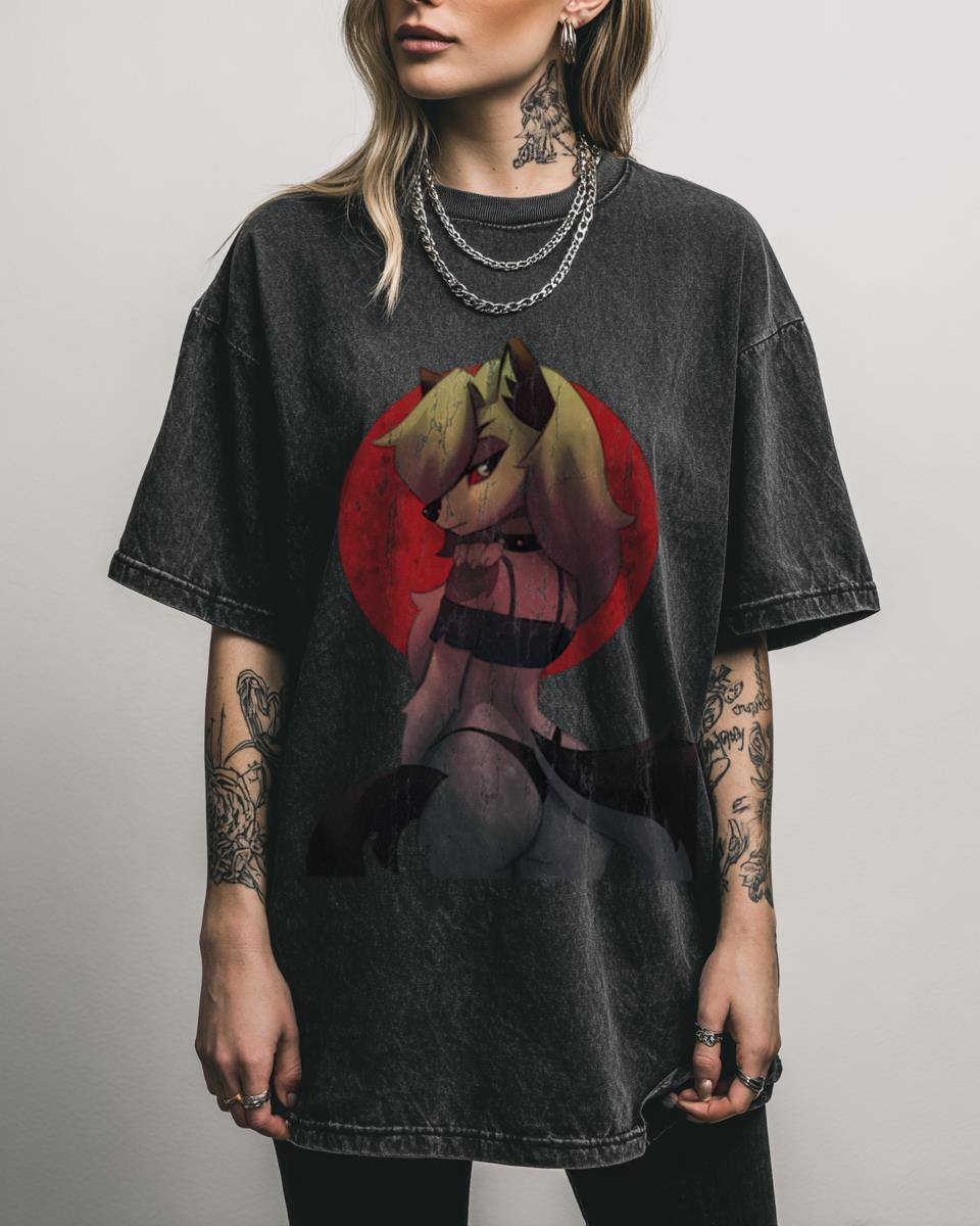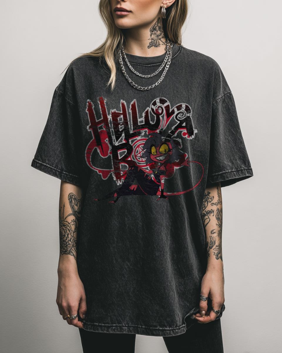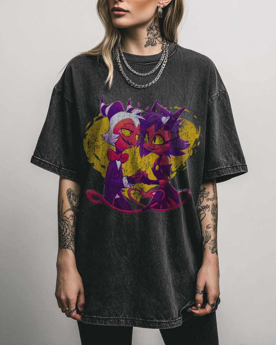 Looking for a Helluva Boss Millie & Moxxie Acidwash T-Shirt? Celebrate your favorite imp couple with this Helluva Boss Millie and Moxxie graphic tee. Featuring a vibrant, fan-inspired design on a fashionable black acidwash background, this comfortable shirt is a fantastic way to showcase your love for the animated series. Key Highlights of This Fan…