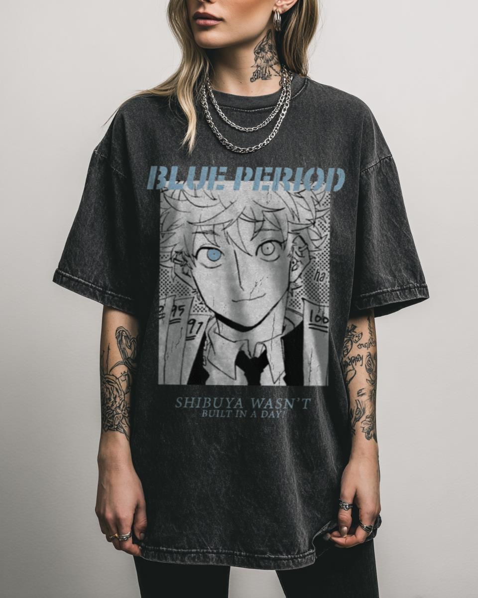 Immerse yourself in the world of art and passion with a unique Blue Period design! Celebrate the captivating narrative of ‘Blue Period’ with this ‘SHIBUYA’ manga panel graphic tee. This design captures a moment from the acclaimed series, possibly featuring protagonist Yatora Yaguchi or other key characters like Hashida Haruka or Maki Kuwana, set against…