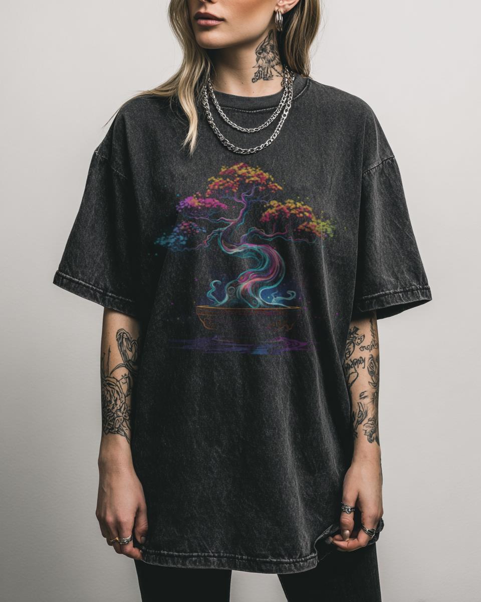 Embrace Zen with This Bonsai Retro Vintage Sunset Tee! Find your inner peace with this unique Bonsai Retro Vintage Sunset T-shirt. Featuring a serene graphic of a bonsai tree against a sunset on a cool black acidwash fabric, this tee is perfect for lovers of Japanese art, meditation, and nature. Why This Bonsai Graphic Tee…
