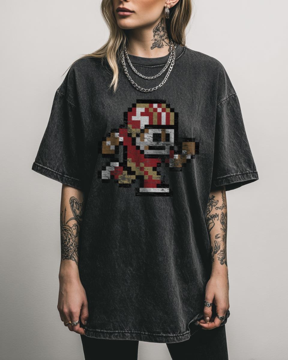 Show Your Team Pride with This San Francisco 49ers T-Shirt? Score a touchdown in style with this retro San Francisco 49ers T-Shirt, featuring a classic Tecmo Super Bowl football graphic. This fan-created design pays homage to the legendary NFL team and vintage gaming, presented on a stylish black acid wash tee perfect for game day…