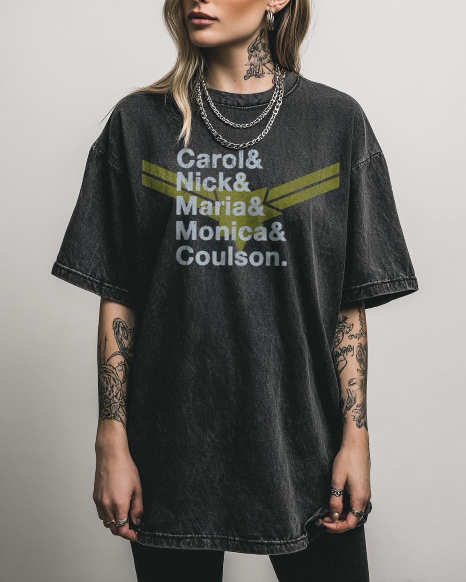 Ready to assemble with the greatest heroes of the cosmos? Join ‘The Captain’s Crew’ with this awesome fan art T-shirt, celebrating the iconic characters from the Captain Marvel universe. Featuring Carol Danvers, Nick Fury, Coulson, and Vers, this design is a must-have for any dedicated fan of the superhero saga, beautifully created by artist lindenash….