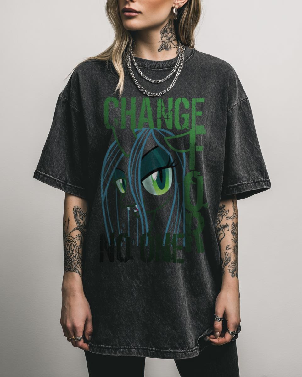 Are you a My Little Pony fan who appreciates the darker, more complex characters of Equestria? Embrace your inner Changeling with this “Change For No One” T-shirt, a bold tribute to Queen Chrysalis from “My Little Pony: Friendship Is Magic”! This design captures the defiant spirit of the iconic MLP villain, perfect for Bronies and…