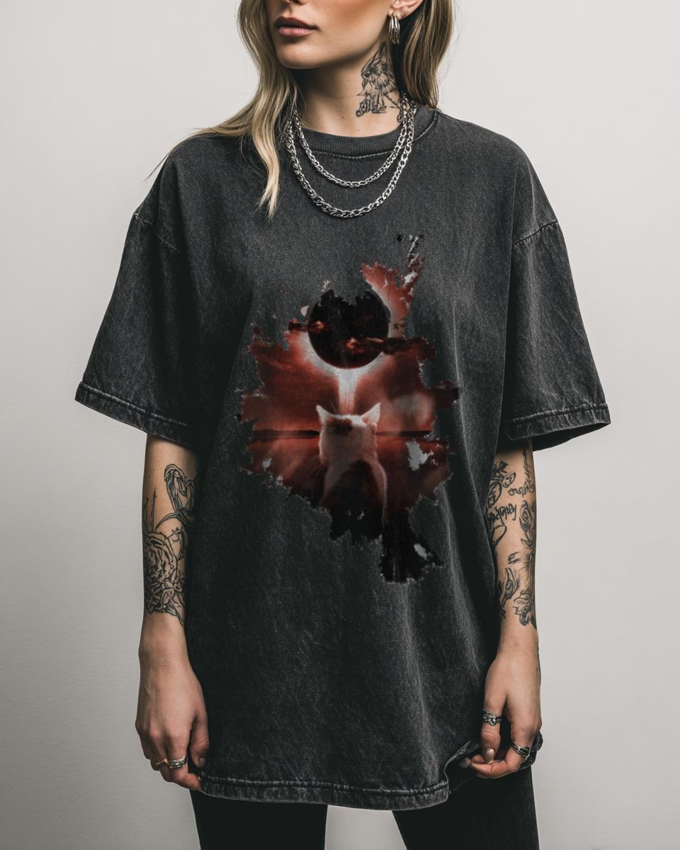 Witness the Mystical with This Stray Cat & Eclipse Berserk Aesthetic Tee! Contemplate the cosmos with this captivating **Stray Cat Looking at an Eclipse Berserk Aesthetic Tee**. Featuring a unique graphic of a lone cat observing an eclipse, infused with a dark fantasy and melancholic aesthetic, this fan-created shirt on a black acidwash finish is…