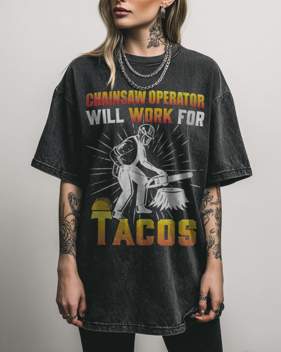 Know a hardworking Chainsaw Operator or Arborist with a great sense of humor and a love for tacos? Bring some laughter to the logging site with this hilarious Black Acidwash T-Shirt, featuring the witty slogan ‘Chainsaw Operator will work for taco.’ This funny design is perfect for arborists, tree surgeons, and anyone who operates a…