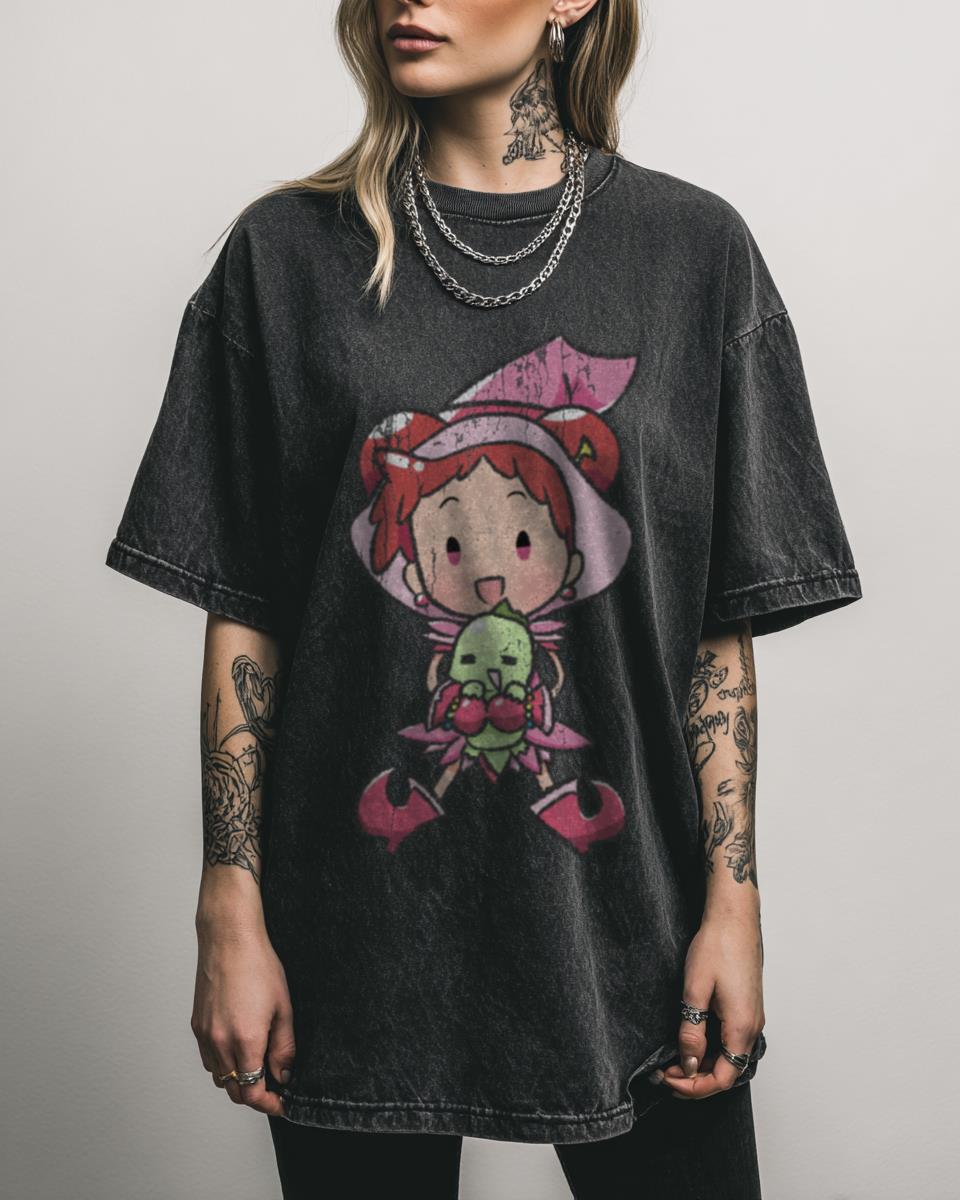 What Makes This Ojamajo Doremi Hana Chibi T-Shirt So Adorable? Bring a touch of magic to your wardrobe with this enchanting Ojamajo Doremi Hana Chibi T-shirt. Featuring a cute graphic of Hana-chan in her signature magical girl style, this black acidwash tee is a delightful piece for any fan of the classic anime. Key Features…