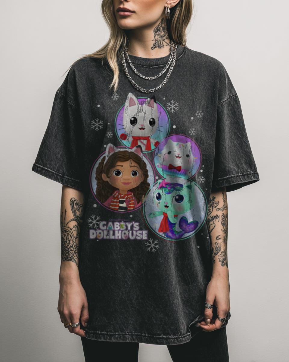 Get into the festive spirit with Gabby and her friends this Christmas! Celebrate a ‘Purr-fect Holiday’ with this ‘Gabby’s Dollhouse Group Christmas Character Snowflake Panels’ design. This delightful tee features Gabby and her beloved cat friends framed in festive snowflake panels, bringing holiday cheer and magic to your child’s winter wardrobe. Ideal for spreading joy…