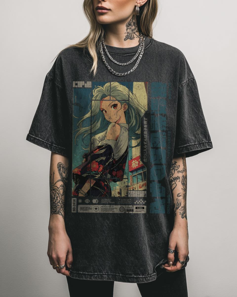 Why Choose This Nostalgic Anime Girl Sunset Graphic Tee? Step into a serene world with our Nostalgic Anime Girl Sunset Street Graphic Tee. This captivating design features a lone figure set against a beautiful sunset cityscape, evoking the classic aesthetics of Japanese animation. Crafted from 100% cotton with a unique black acidwash, it’s a must-have…