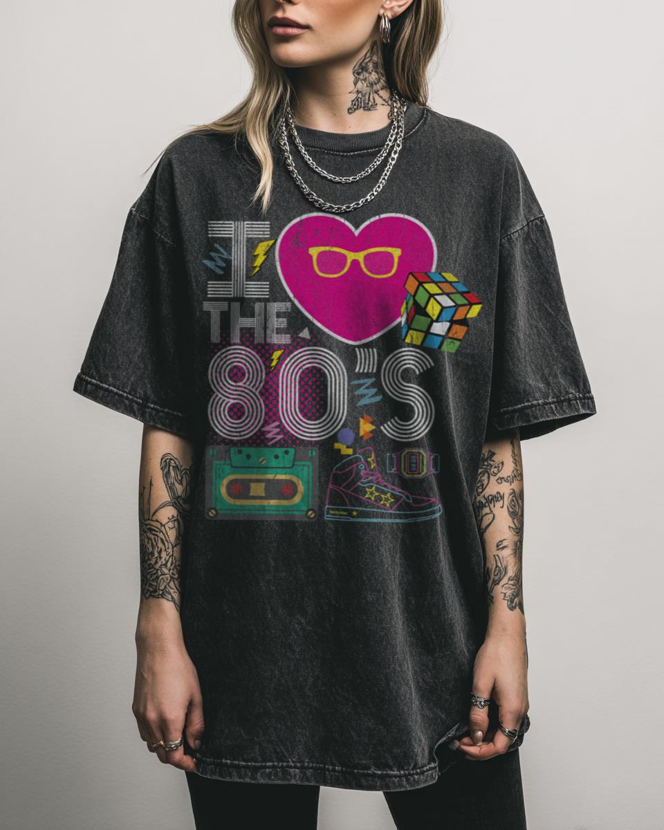 Do you fondly remember the neon lights and iconic sounds of the 1980s? Celebrate the most rad decade with this “I Heart the 80s” T-shirt! This retro graphic features classic 80s symbols like a boombox and Rubik’s Cube, making it the perfect nostalgic piece for anyone who grew up in the eighties or simply loves…