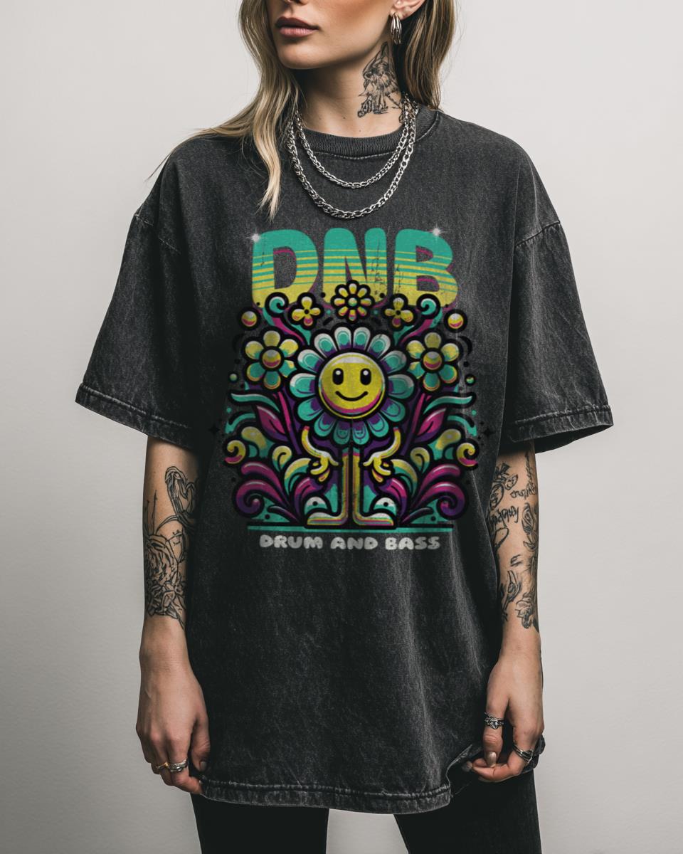 Ready to hit the dance floor with some vibrant DNB vibes? Express your love for Drum & Bass music with this ‘Floral Smiley Vibes’ graphic tee. Featuring a cheerful smiley face adorned with floral elements in teal and yellow, this design perfectly captures the energetic and positive spirit of rave culture, festivals, and DNB nights….