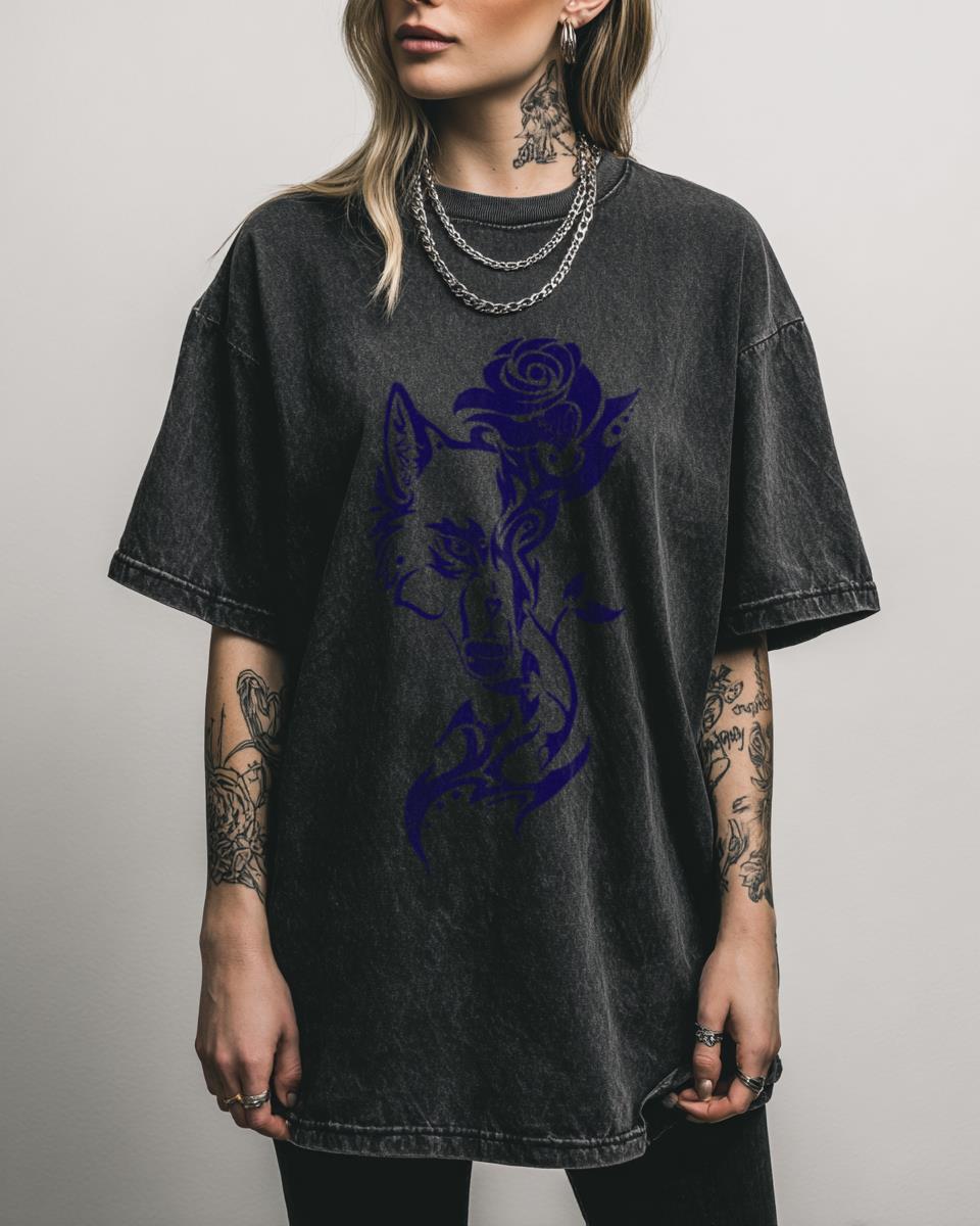 What Symbolism Does the Blue Wolf with a Rose Hold in Fantasy Art? Embrace the mystical with our Blue Wolf Face with Rose T-Shirt, a colorful fantasy art design blending vintage aesthetics with themes of magic and mythology. This black acidwash graphic tee, made from 100% heavyweight cotton, is perfect for fans of wolves, Elfquest,…