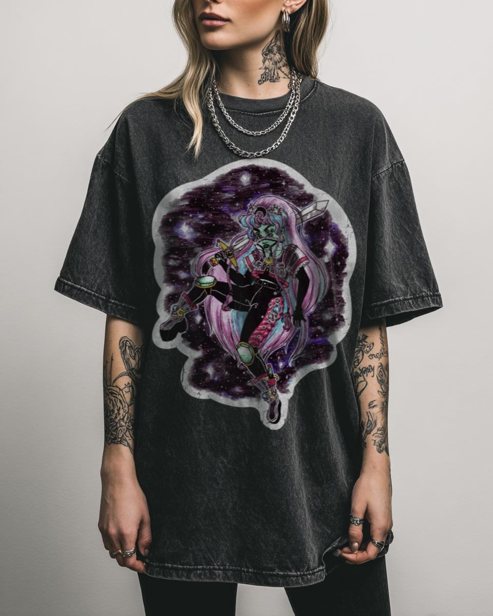 Embark on an intergalactic adventure! Unleash your inner cosmic hero with this stunning Moon Warrior T-shirt. Featuring a powerful warrior woman wielding a sword against a backdrop of a nebula-filled galaxy and night sky, this design combines magical girl aesthetics with classic 90s sci-fi. It’s perfect for fans of space opera, strong female characters, and…