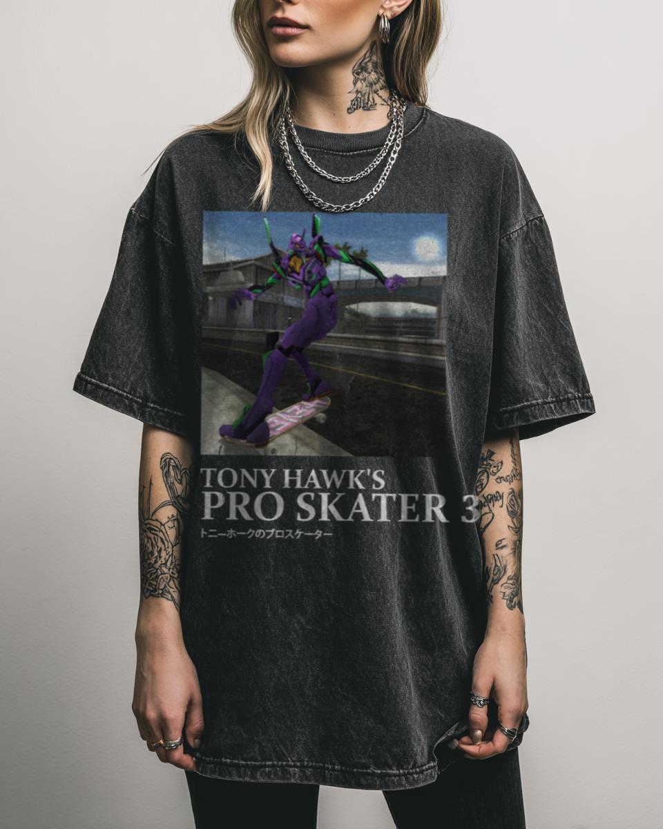 What happens when skateboarding legends meet iconic anime? Experience the ultimate crossover with ‘Tony Hawk’s Neon Genesis Evangelion 2’ T-shirt! This unique design blends the world of legendary skater Tony Hawk with the profound themes of Neon Genesis Evangelion. It’s a perfect graphic for fans of both classic gaming, groundbreaking anime, and unexpected pop culture…