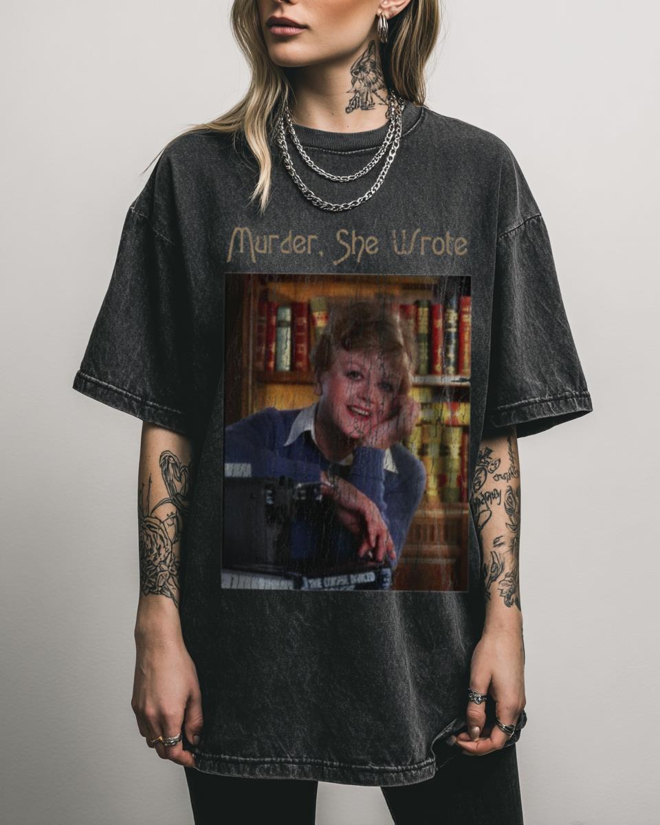 Solve the Mystery with This Vintage Murder She Wrote Jessica Fletcher T-Shirt? Embrace your inner detective with this Vintage Murder She Wrote Jessica Fletcher T-Shirt! This fan-created graphic tee celebrates the iconic 80s TV show and its beloved mystery writer, Jessica Fletcher, played by Angela Lansbury. The unique black acidwash fabric adds a retro, charming…