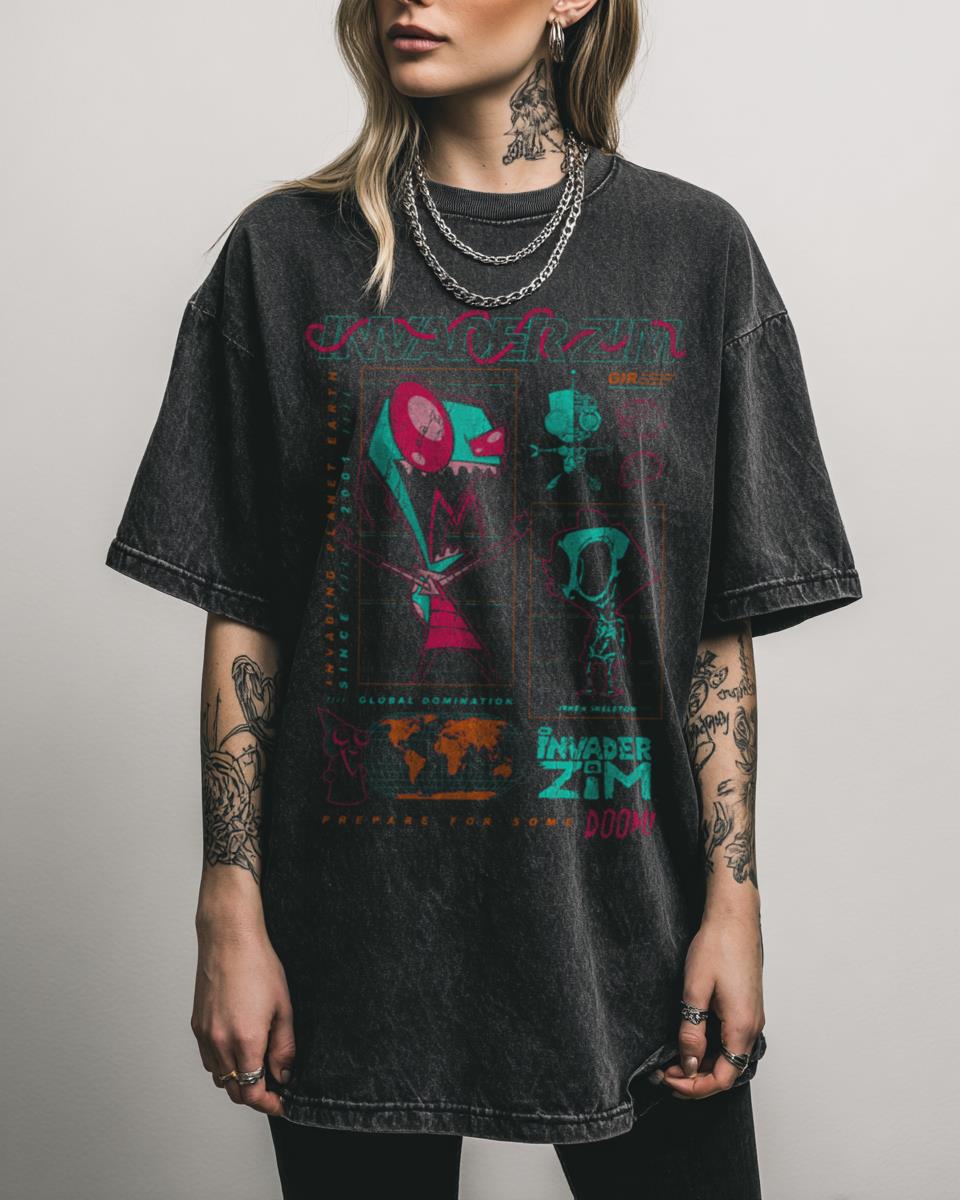 Ready to join Zim’s quest for universal conquest in style? Embrace your inner Irken invader with this unique graphic tee featuring Invader Zim’s “Global Domination Graphic Schematics.” This intricate design showcases Zim’s plans for Earth, blending sci-fi seriousness with the show’s signature humor, perfect for fans who appreciate the genius (or lack thereof) behind his…
