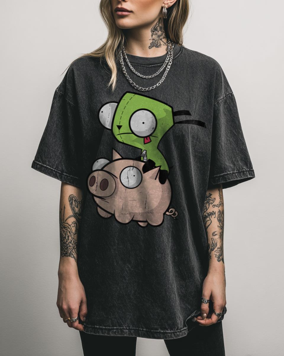 Remember the chaotic charm of Gir and his adorable, yet destructive, piggy from Invader Zim? Relive the hilarity of Invader Zim with this ‘Gir Flying on Piggy’ T-shirt! This iconic cartoon moment captures Gir’s whimsical and often nonsensical adventures, riding his trusty piggy. It’s a nostalgic and fun design for any fan of the beloved…
