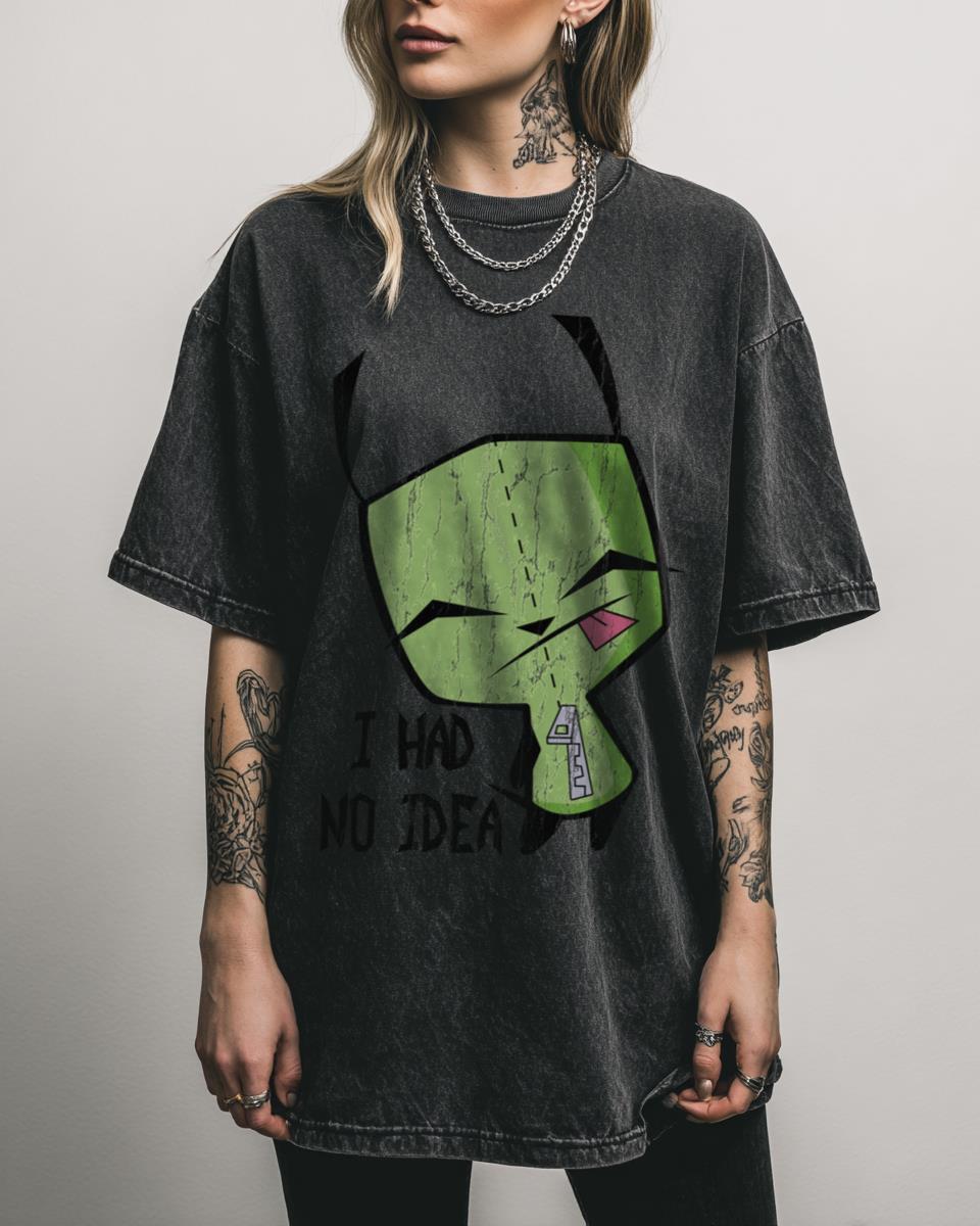 Do you ever find yourself in a situation where you just… had no idea? Relive one of GIR’s most iconic moments with this Invader Zim design featuring GIR in his adorable dog costume, alongside the classic quote, ‘I Had No Idea’. This tee perfectly captures the lovable naiveté and humor of Nickelodeon’s favorite alien robot….