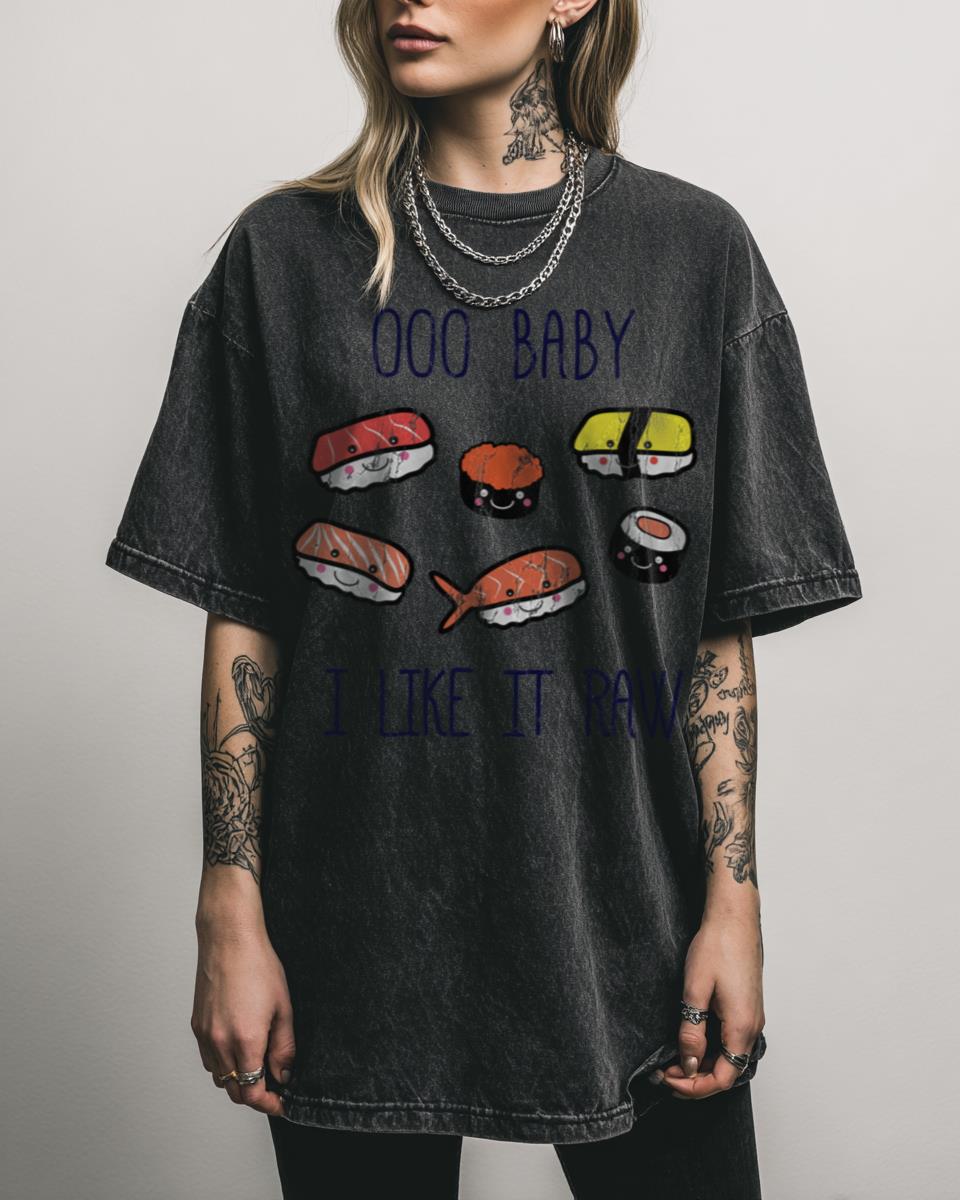 Do you have a raw passion for sushi and a great sense of humor? Express your love for Japanese cuisine and classic hip-hop with our ‘OOO BABY I LIKE IT RAW!’ design. This fun graphic combines a catchy meme phrase with adorable sushi cartoons, making it perfect for sushi lovers, foodies, and fans of Ol’…