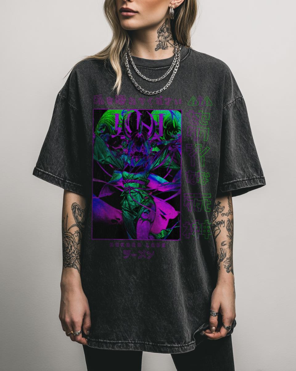 Looking for a blend of cute and edgy in your anime fashion? Embrace your dark yet adorable side with this ‘Snap Back’ acidwash T-shirt, featuring a charming demon girl with horns. This design blends kawaii aesthetics with goth, grunge, and punk elements, perfect for fans of pastel goth and alternative anime. It’s a unique and…