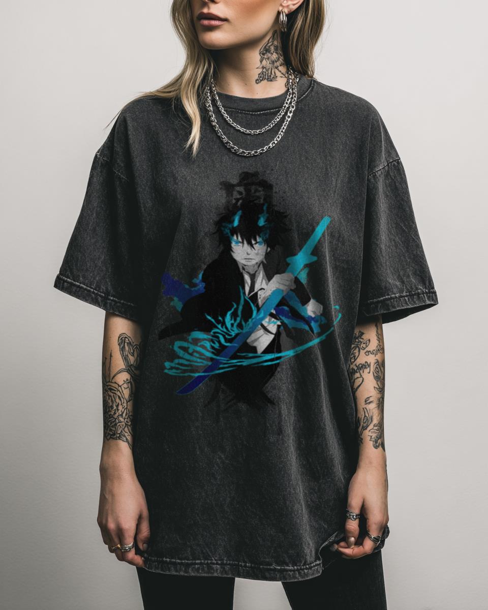 Who is Rin Okumura, the Demon Exorcist of Ao no Exorcist? Unleash your inner demon slayer with our Rin Okumura Blue Exorcist T-Shirt, a fan-created design featuring the powerful protagonist with his signature blue flames and katana. This black acidwash graphic tee, made from 100% heavyweight cotton, is perfect for fans of the Ao no…