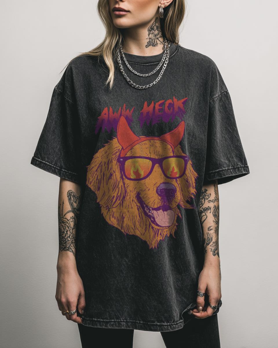Why is the “Aww Heck” Funny Devil Dog T-Shirt a Retro Delight? Get ready for some retro laughs with this “Aww Heck” funny devil dog t-shirt, featuring a cool Golden Retriever puppy in shades and devil horns. This 80s-inspired graphic tee, made from 100% heavyweight Black Acidwash cotton, is perfect for dog lovers and fans…