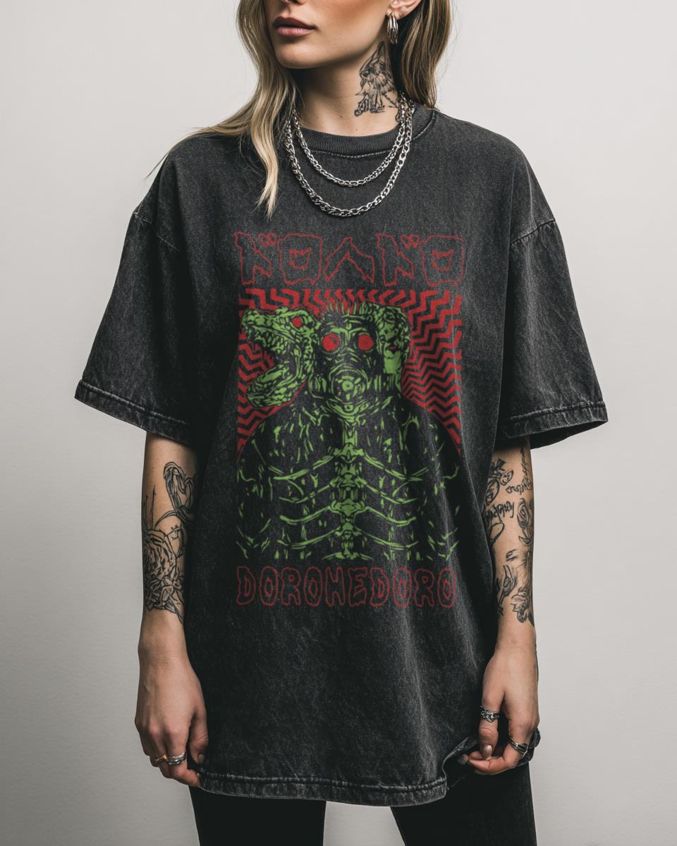 Unleash Your Inner Lizard with This Kaiman Dorohedoro Manga Anime T-Shirt! Journey through the grim and captivating world of Hole with this “Kaiman – DOROHEDORO” graphic tee, featuring a powerful manga-inspired design with a distinct 90s anime aesthetic. This black acidwash shirt is a must-have for fans of dark fantasy, horror, and the unique artistry…