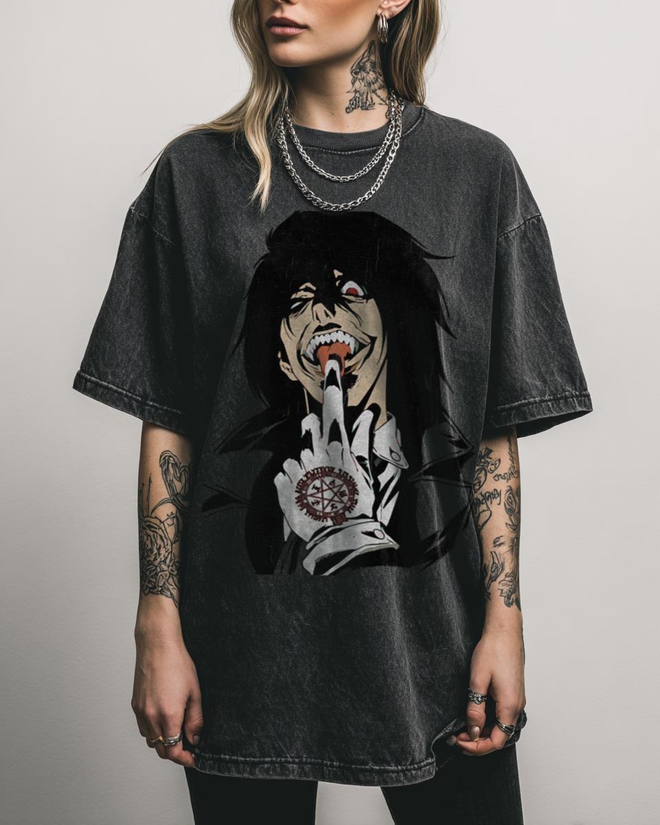 Searching for a Hellsing Anime Alucard Vampire T-Shirt? Show your dedication to the Hellsing Organization with this **Hellsing Anime Alucard t-shirt**. Featuring a fan-inspired design with Alucard and the Hellsing symbol, this 100% heavyweight cotton tee with a black acidwash finish is perfect for otaku and dark fantasy fans. Why This Hellsing Graphic Tee is…