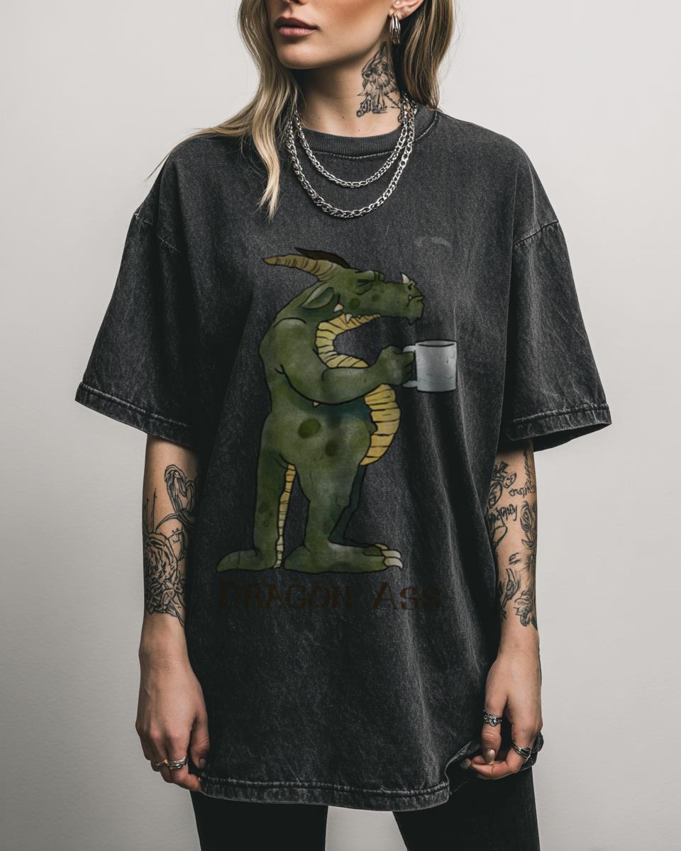 Why Is This Funny “Dragon Ass” Tee Perfect for Your Monday? Start your week with a chuckle with this funny “Dragon Ass” T-shirt, depicting a sleepy, coffee-craving dragon experiencing burnout. Perfect for anyone who feels the Monday struggle, this black acidwash graphic tee is a humorous piece of fantasy art for coffee lovers and monster…