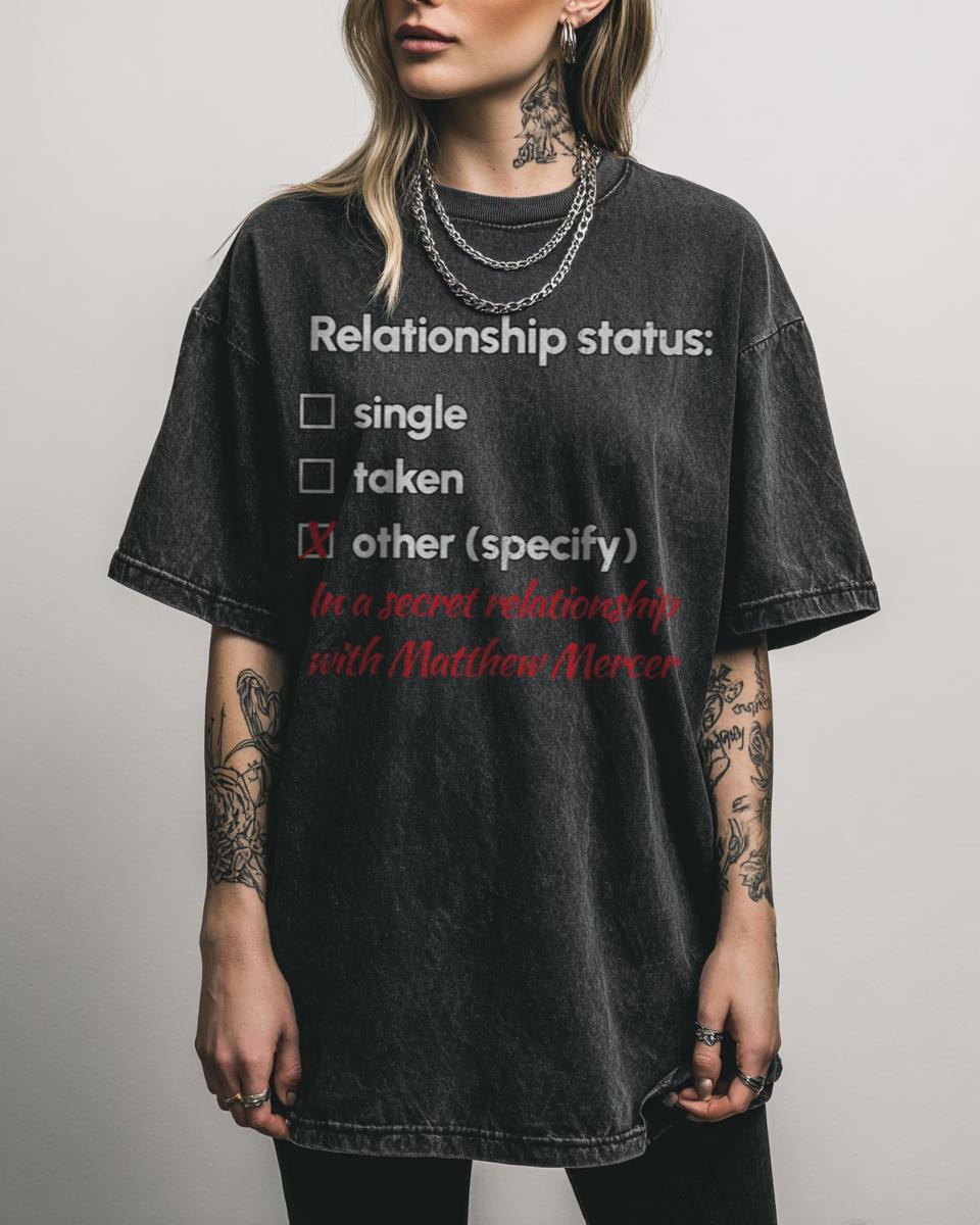 Looking for a unique way to celebrate your favorite Dungeon Master? Show your appreciation for the legendary Matthew Mercer with this ‘Matthew Mercer – Relationship 2’ T-shirt! Featuring a clever quote inspired by Dungeons and Dragons and the world of Critical Role, this design is perfect for fans of D&D, roleplaying games, and the charismatic…