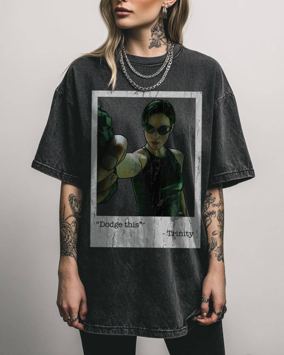 Are you ready to re-enter the Matrix and embrace its iconic style? Step into the dystopian future with this striking graphic t-shirt featuring Trinity, the legendary hacker and warrior from ‘The Matrix’ movie series. This portrait design captures her cool, enigmatic presence, making it a must-have for fans of the groundbreaking science fiction film. A…