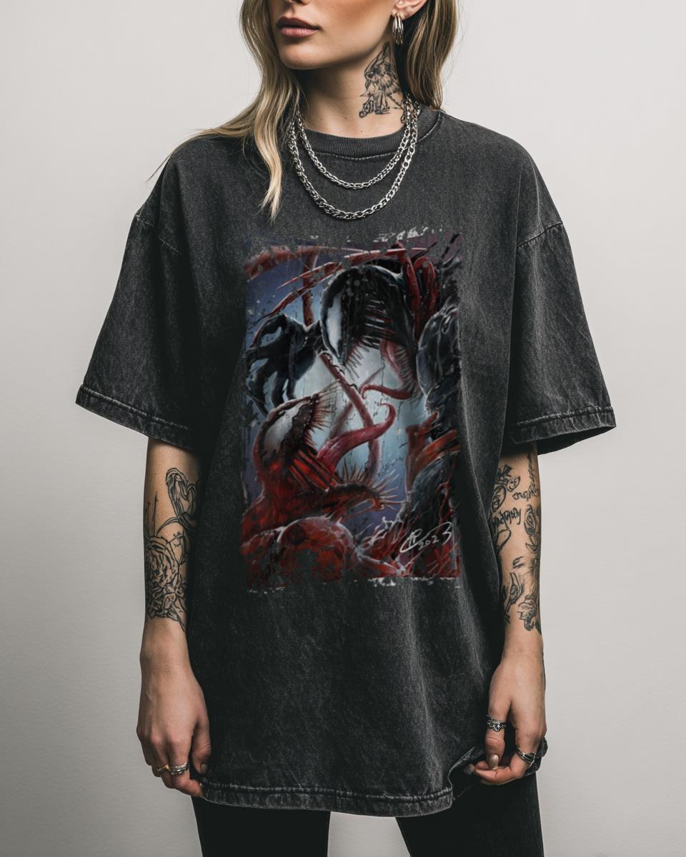Are you a fan of the iconic and terrifying Marvel symbiotes, Venom and Carnage? Unleash your inner anti-hero with this ‘Venom Carnage’ t-shirt, featuring dynamic fan art of the two legendary Marvel symbiotes. This design captures the raw power and menacing presence of both Venom and Carnage, making it a perfect piece for comic book…