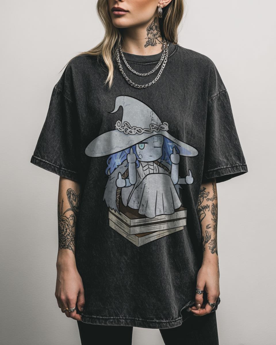 Discover the Charm of This Ranni the Witch Elden Ring Chibi T-Shirt! Journey to the Lands Between with this adorable Ranni the Witch Elden Ring Chibi T-shirt. Featuring a cute, fan-created design of the beloved blue-skinned witch, this black acidwash graphic tee is a must-have for any Tarnished or Elden Ring fan who appreciates kawaii…