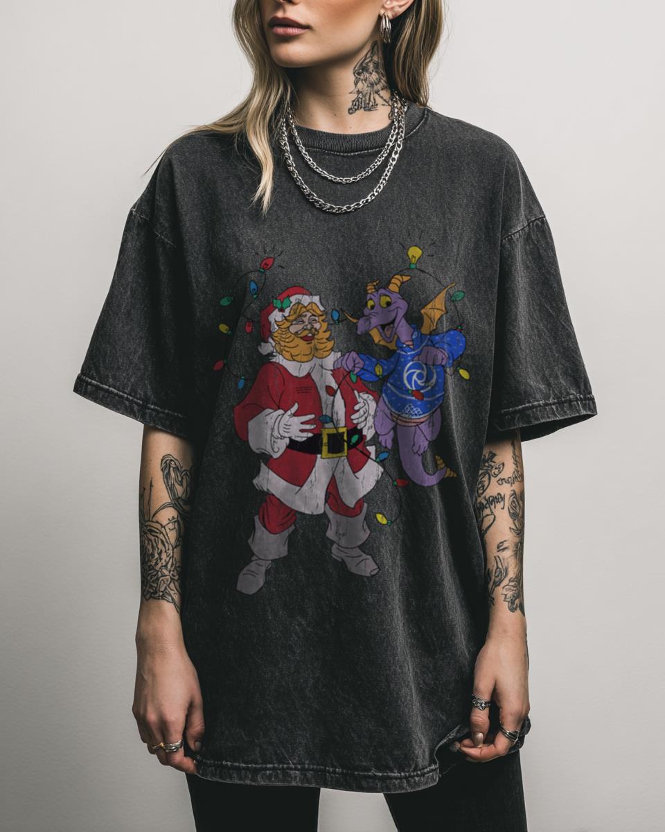 What Makes the Christmas Figment Dreamfinder Santa T-Shirt So Magical? Celebrate the holidays with a touch of Epcot magic in this Christmas Figment Dreamfinder Santa T-shirt. Featuring the beloved purple dragon Figment alongside a festive Dreamfinder Santa, this black acidwash tee is perfect for Disney fans during the holiday season. Key Features of This Disney…
