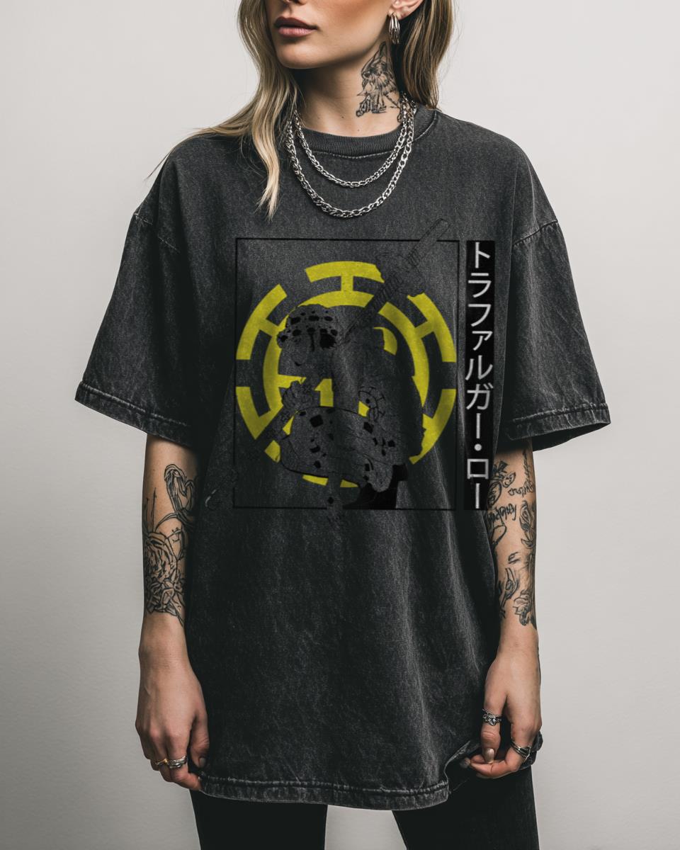 Ready to showcase your allegiance to the ‘Surgeon of Death’ from One Piece? This striking graphic t-shirt features a dynamic fan art illustration of Trafalgar Law, the formidable captain of the Heart Pirates. Rendered in a compelling style, the design captures his cool, badass persona, perfect for any devoted One Piece fan or anime enthusiast….